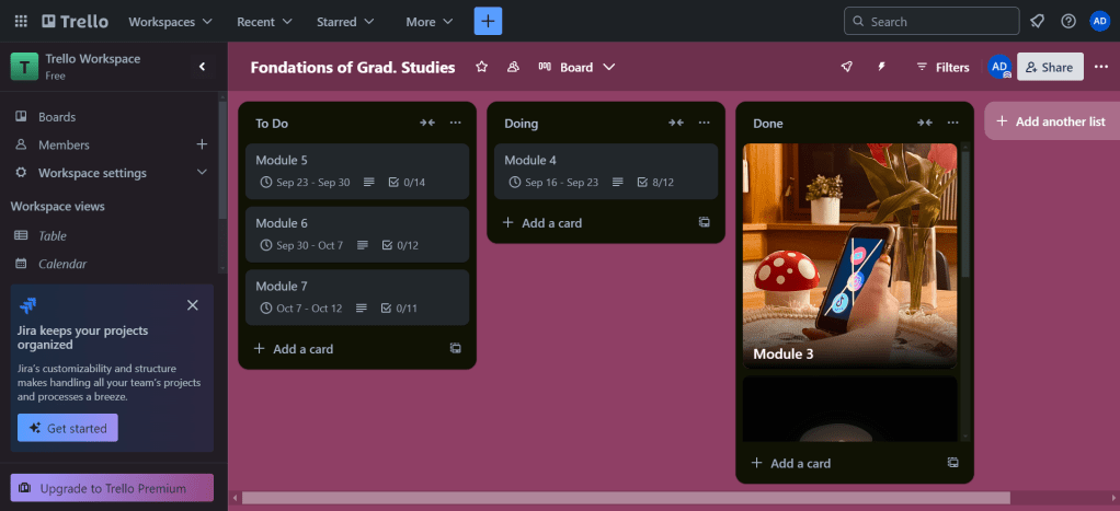 I am super proud of my project management system. I have been trying it for 3 days now, and it’s honestly really helpful when handling the individual modules. Having a time frame of what to do, when to do it and what is currently in progress or done was extremely helpful for me. I don’t like being all over the place, especially with my work so Trello was super beneficial. Project management as a whole has also been useful for me. Seeing the unique ways I can handle my tasks was extremely useful in the long run. I will continue using this system, and I highly recommend you start using a project management system more often.