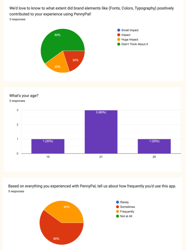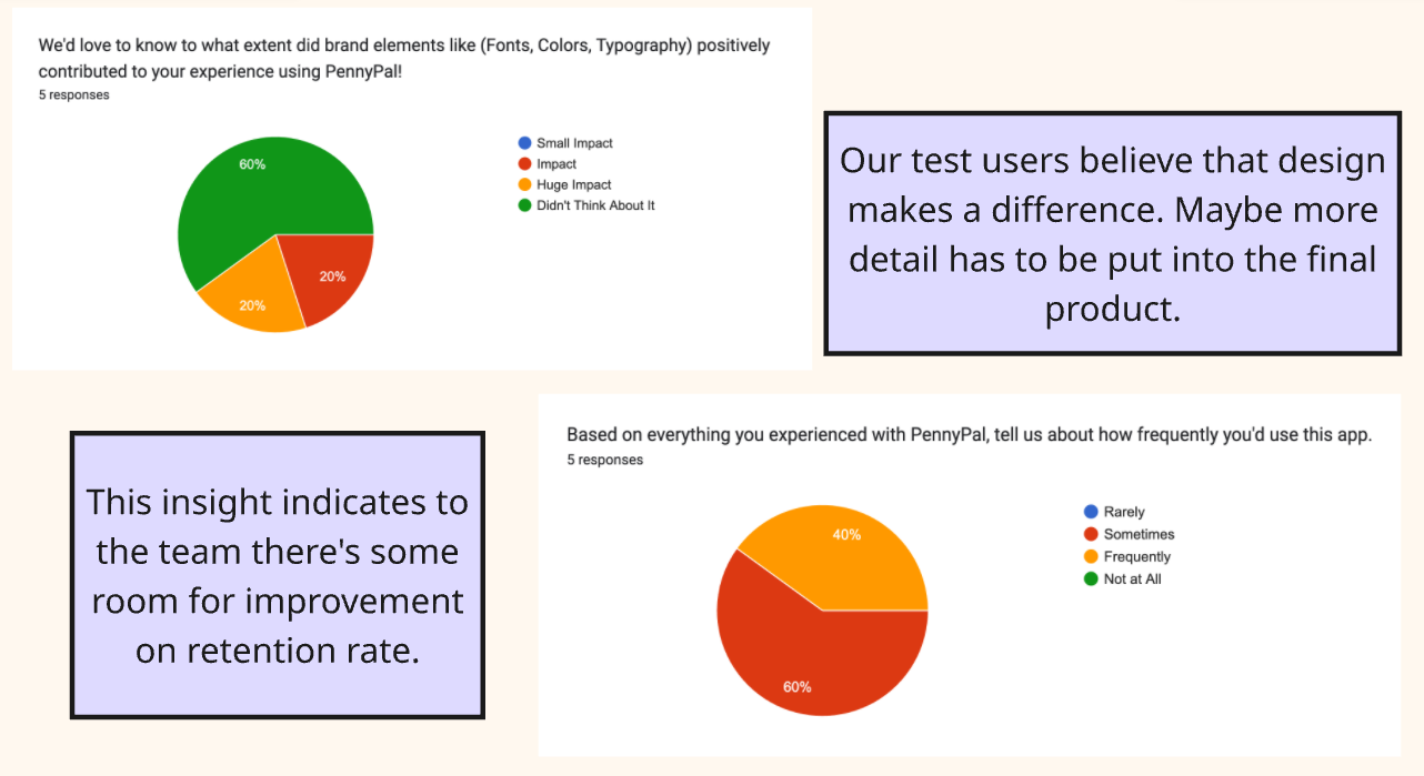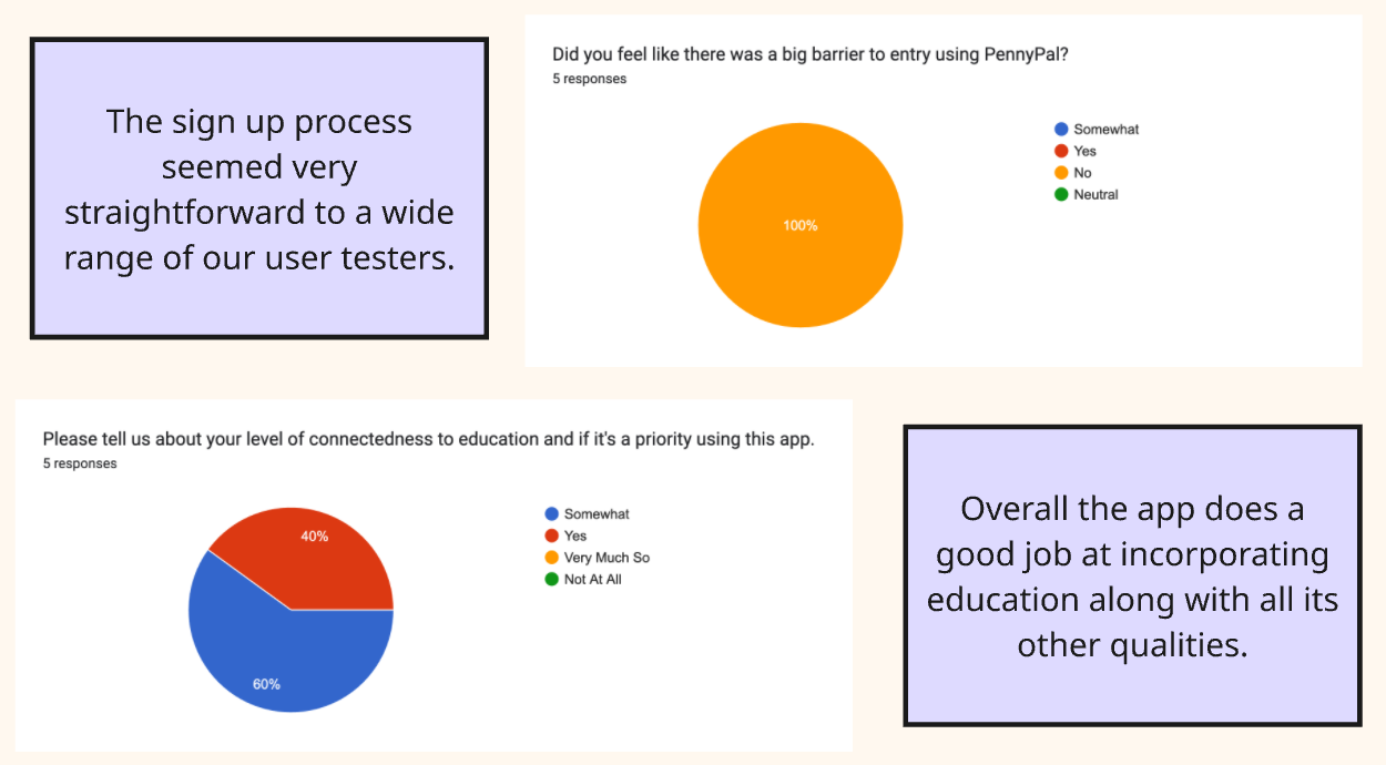The user testing lasted for almost 2 hours. During these user testing slots, PennyPal came off to be a successful app. Many of the users found that the app was easy to navigate and overall provided content they thought was useful. Many user testers were fond of the games and goal setter system, especially as the games helped bring fun and creativity, and the goal setter could set their own goals on what to learn and could create a healthy system of goals to improve their finances. An interesting insight we found was how expressive the testers were; they seemed genuinely excited about exploring the different app features and what they could do.