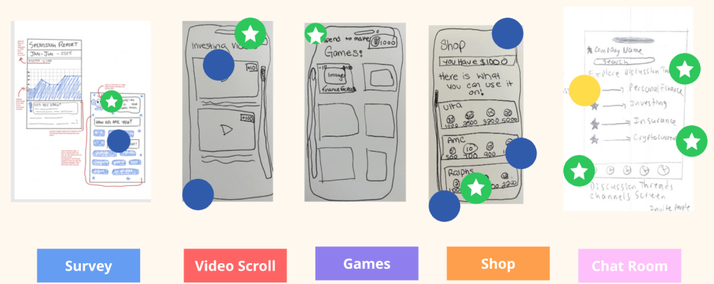 Phase 2 activities had Voting, User Flows, Storyboard. We began with voting. We used Heat Map voting as it allowed for everyone to voice their opinions on which sketches they liked the most. After the sketches were finalized, the decider chose the 5 sketches they liked the most, guaranteeing that those sketches would be the start of the storyboard.