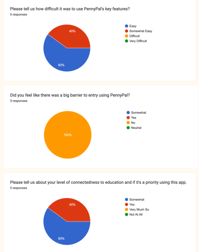 I say this because our goals were completed, and PennyPal was able to provide an experience for its users that was both fun and informative. This app requires some changes, but regardless, a lot of the benefits that came from PennyPal made it so that in the future: