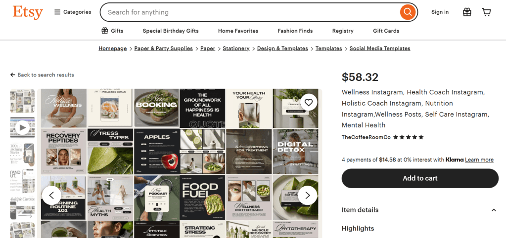 - Etsy: Provided a greater variety of templates and ideas. Focused more on promoting health and scheduling what to do, rather than selling a book. Had okay prices.