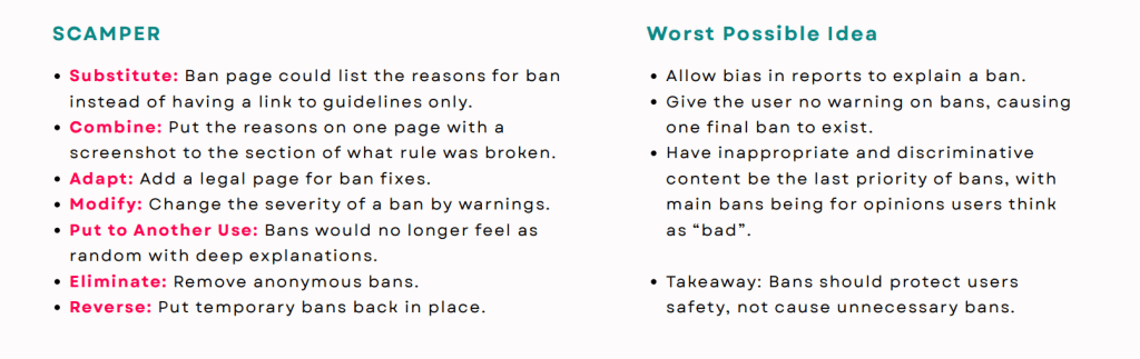 The POV statements for TikTok were on 1. how to solve the lack of ban information, and 2. having an auto play feature. POV 1’s best techniques were SCAMPER and Worst Possible Idea. Of all techniques so far, SCAMPER (Substitute, Combine, Adapt, Modify, Put to another use, Eliminate, and Reverse) is the most unique. It helped provide a way to manage an idea through adapting, eliminating, and substituting elements of how a ban could work. Worst Possible Idea was the other technique because I had to think of ideas that would never work well for bad information, thus showing what a user would want for a solution.