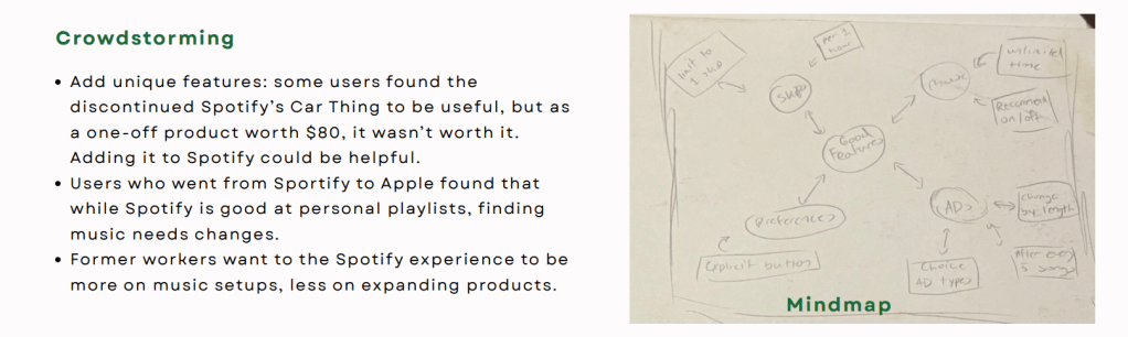My POV statements for Spotify focused on 1. fixing Spotify’s free interface, and 2. Having hidden content features. The best options for POV 1 were Crowdstorming and Mind-maps. I wanted to look at other sources of ideas, So I read about discontinued products and users who switched platforms. I learned that new features could be added to make the free interface better, like adding Spotify’s Car Thing (which allowed for easy access on devices that were older). Mind-maps were helpful because they allowed me to expand on solutions for the different parts of the interface.