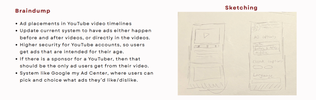 My POV statements for YouTube focus on 1. YouTube’s advertisement control and 2. accessibility to preferences like closed captions, auto play, and playback speed. For POV 1, I chose Braindump and Sketching as my main ideation techniques. Braindump is helpful because I can write down any idea and just write down whatever comes to mind, while Sketching provides a visual representation of the two best ideas.