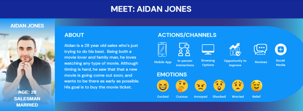 They represent the audience. The persona includes demographics, personality, and influences. For example, my persona is Aidan Jones, a 28-year-old movie lover looking to purchase a movie ticket. He’s a family man and works as a salesman, so timing and money play a key role in his process.